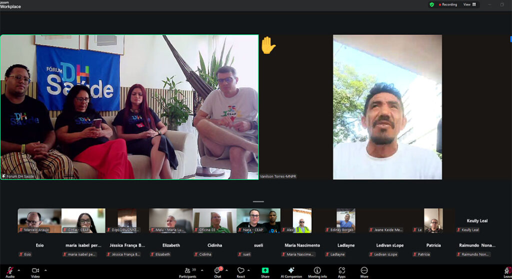 Representando o Movimento Nacional da População de Rua (MNPR), Vanilson Torres também contribuiu com uma fala contundente sobre a urgência de medidas devido às mudanças climáticas. “É muito importante que, na COP30, quem produz a desgraça climática assuma suas responsabilidades. Até 2050, a temperatura poderá subir 2,5ºC. Os países ricos precisam entender que não se respira através do dinheiro. Precisamos nos conscientizar e nos salvar, não só a nós, mas aos nossos filhos e netos. O capitalismo é essa desgraça: as pessoas querem mais e mais dinheiro. Que essa ordem mundial compreenda que, se não mudarmos nossos pensamentos, não haverá futuro. Viva o Fórum Direito Humano à Saúde, viva o DiHálogos com DH.”